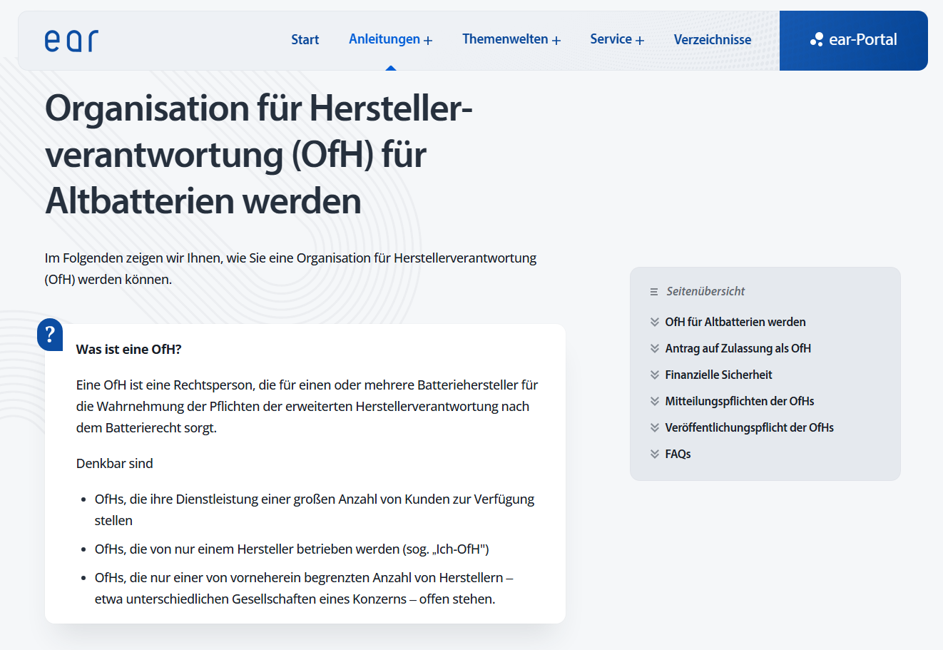OfH (Organisation für Herstellerverantwortung), or "Producer Responsibility Organization," is an EPR recycling management organization approved by the German Federal Environment Agency (EAR) and officially endorsed. Under the old regulations, recycling was often decentralized and fragmented; under the new regulations, OfH has become the sole compliant bridge. It is not only responsible for reporting data to the EAR but also directly manages the recycling network covering all of Germany. This means that without a legitimate OfH binding, your battery registration number (WEEE-Reg.-Nr.) will become worthless.