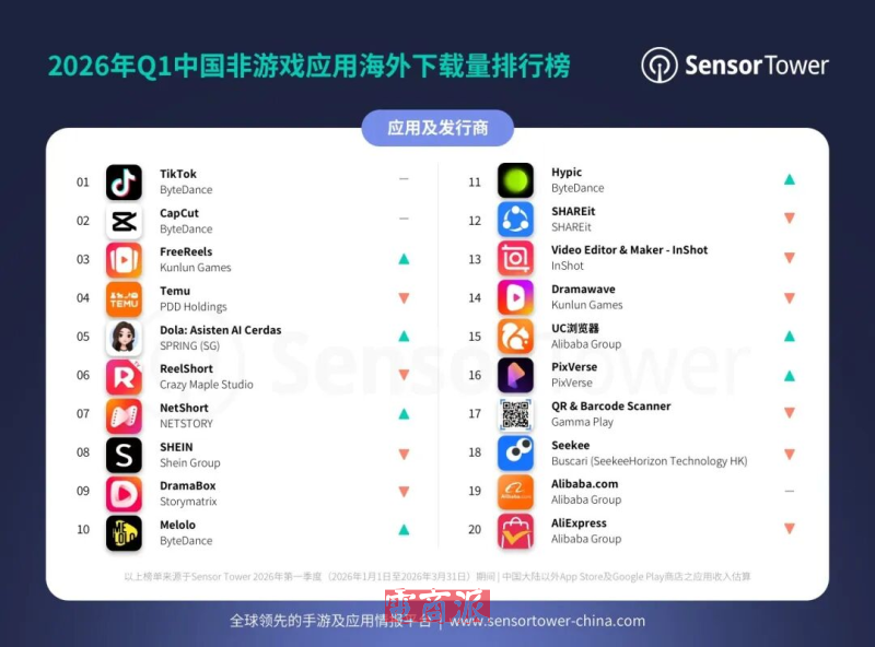 According to the latest data from Sensor Tower, in the first quarter of 2026, the global non-game mobile app market maintained growth overall, with both downloads and revenue increasing. In the content and cross-border e-commerce sectors, TikTok's global MAU (Monthly Active Users) exceeded 2 billion for the first time, while TEMU and SHEIN's MAUs reached 530 million and 440 million respectively.