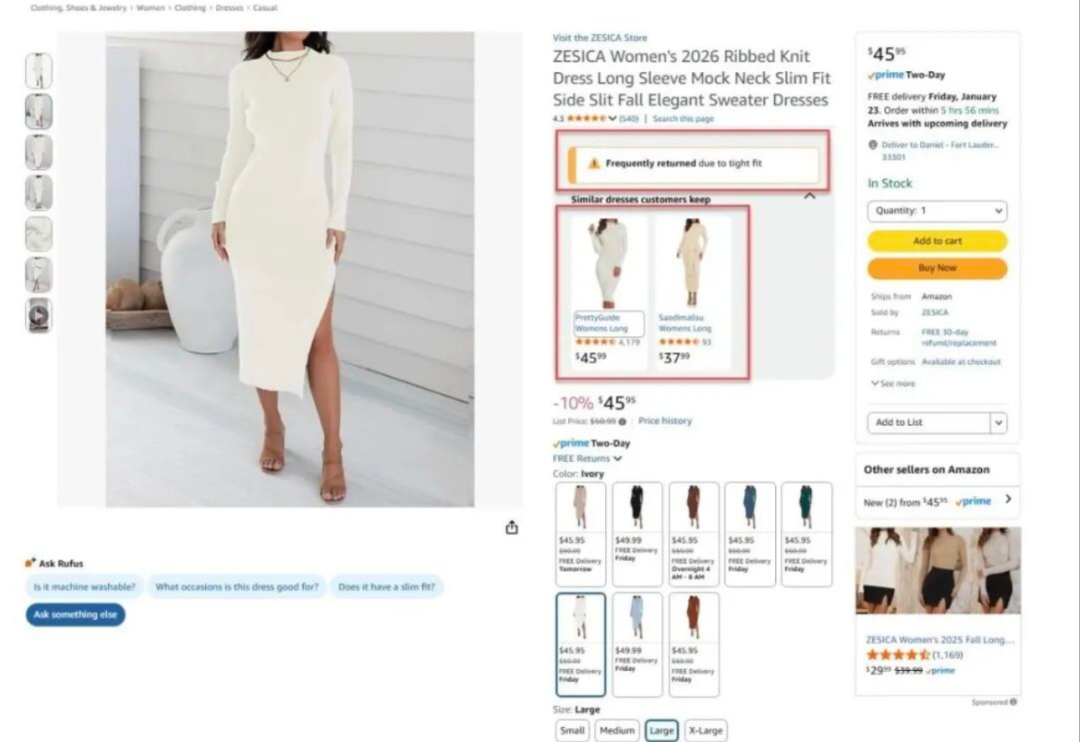 As shown in the image above, the return reason for the women's clothing link is "tight fit" (size too small). Combined with Rufus's question in the lower left corner of the main image, buyers can intuitively understand the evaluations of other customers for a product. Moreover, below the label, "similar products ordered by other buyers" are recommended for buyers' reference.
