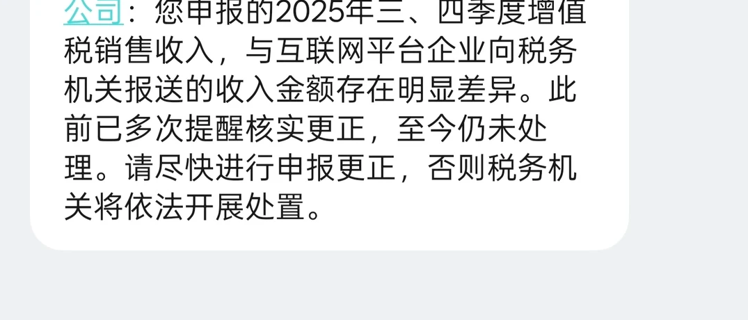 The notice content shows that the sales revenue previously declared by the relevant sellers differs significantly from the income amount reported by the platform to the tax authorities. Since there have been multiple reminders to verify and correct, and it has not been dealt with to date, the tax bureau requires the declaration correction to be completed as soon as possible; if the delay continues, the tax authorities will take legal action.