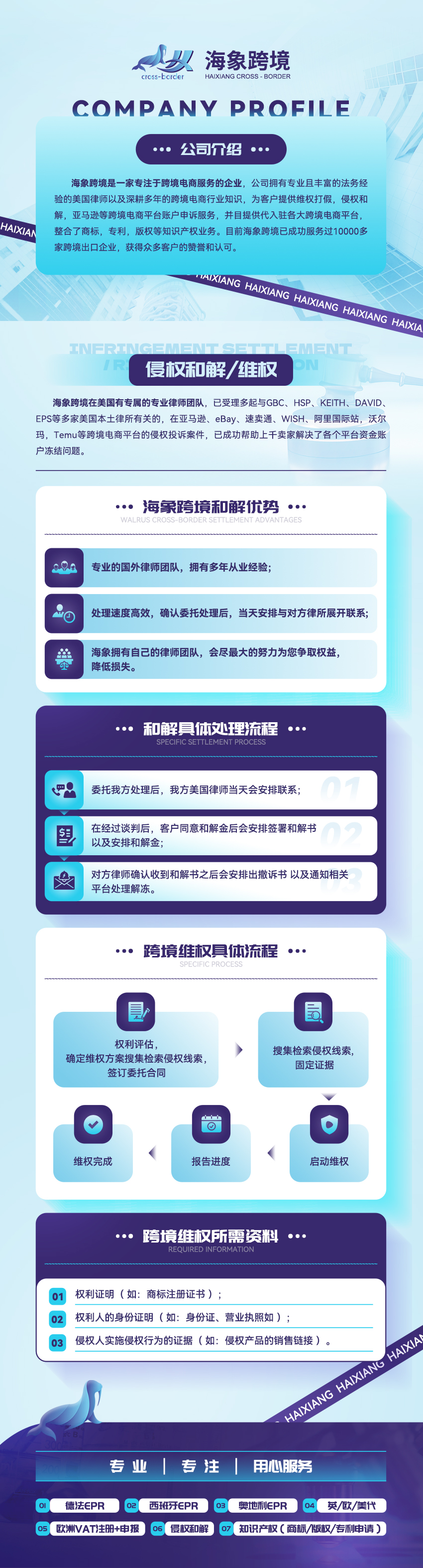 1. Intellectual property infringement risk assessment + customized solutions and strategies 2. Negotiations to reduce the amount of compensation required, in order to prevent the account funds from being depleted entirely 3. Guidance on compliance-related listing procedures, to help avoid additional risks