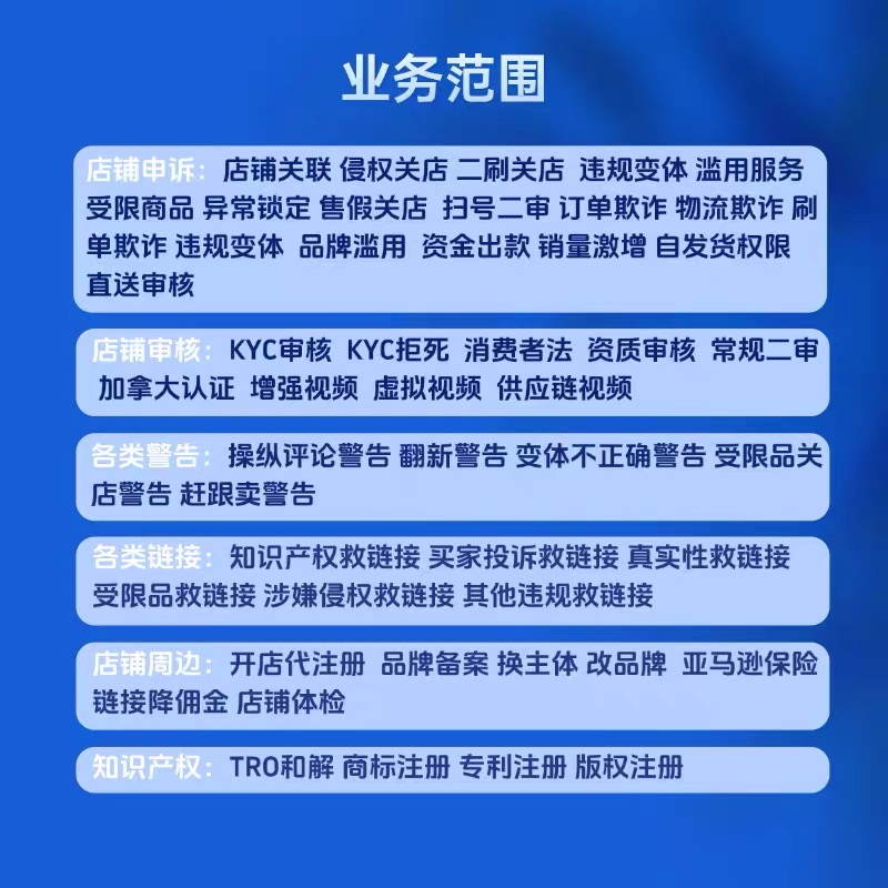 Amazon infringement complaints; suspension of related stores; brand abuse; complaints regarding links; financial-related complaints; complaints regarding the authenticity of products.