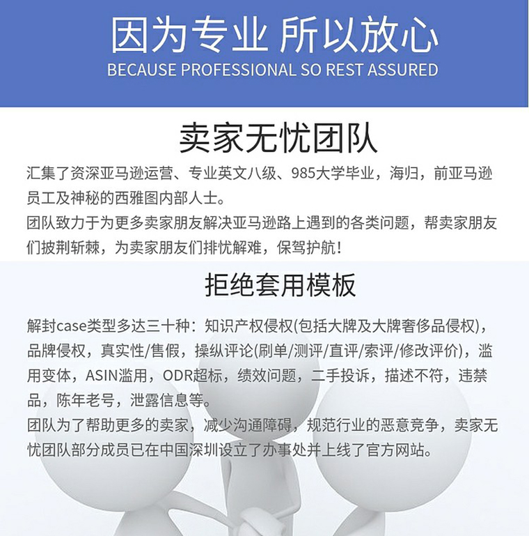 The “Sellers Without Worry” team is composed of experienced Amazon operators, individuals who have passed the Professional English Test Band 8, graduates from 985 universities, returnees from abroad, as well as a team of strategic cooperation lawyers and consultants. Five years ago, the core members of this team began their entrepreneurial endeavors by operating Amazon accounts and creating multiple bestsellers across various product categories. As Amazon later opened up global sales, a large number of sellers flocked to the platform, leading to increasingly fierce competition and a plethora of malicious practices. During this process, the team encountered numerous challenges: accounts were closed for various reasons, they were subject to malicious complaints that resulted in account suspensions, they faced unauthorized follow-sales attempts at night, and their product listings were even tampered with. In dealing with these problems, the team embarked on a form of “re-entrepreneurship” within their own organization, pooling various resources to form the “Sellers Without Worry” team – a group consisting of lawyers and professionals specializing in Amazon services. Their goal is to use their modest efforts to help more sellers overcome the various challenges they face on Amazon, providing them with support and assistance to ensure their success! Over the past few years, the “Sellers Without Worry” team has served more than 10,000 sellers. They have provided free assistance to Amazon sellers in answering various questions on over 8,000 occasions, and have successfully obtained the reinstatement of more than 4,000 seller accounts, thereby preventing unnecessary losses for these sellers. Their work has contributed to the healthy development of the cross-border e-commerce sector and promoted entrepreneurship and employment in this area. As a result, they have been hailed as the “lawyers of the Amazon community.”