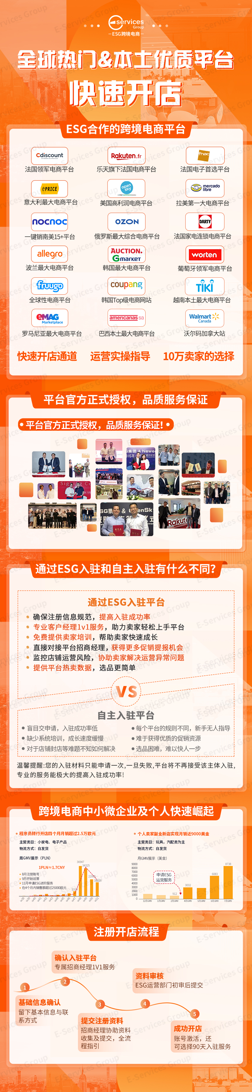 ESG Cross-border E-commerce provides Chinese sellers with one-stop services for setting up and operating cross-border businesses on multiple popular mainstream platforms, as well as over 30 high-quality local e-commerce platforms.