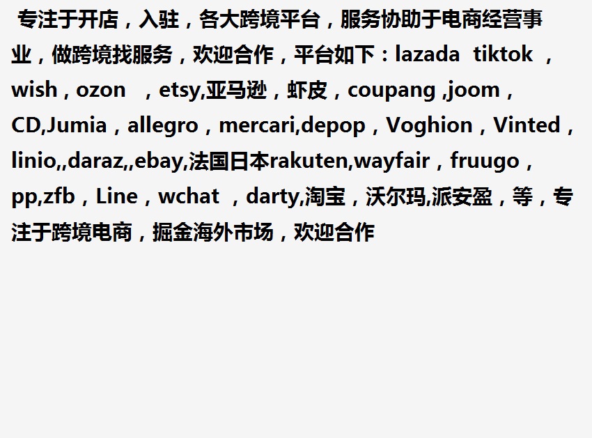 Focusing on opening stores and gaining listings on various cross-border platforms, our services support e-commerce businesses. If you are looking for assistance in conducting cross-border transactions, we welcome cooperation with the following platforms: Lazada, TikTok, Wish, Ozon, Etsy, Amazon, Xiapai, Coupang, Joom, CD, Jumia, Allegro, Mercari, Depop, Vogion, Vinted, Linio, Daraz, eBay, Rakuten (France/Japan), Wayfair, Fruugo, PP, ZFB, Line, WeChat, Darty, Taobao, Walmart, Pai Anying, and more. We specialize in cross-border e-commerce and helping businesses tap into overseas markets. Cooperation is highly welcome.